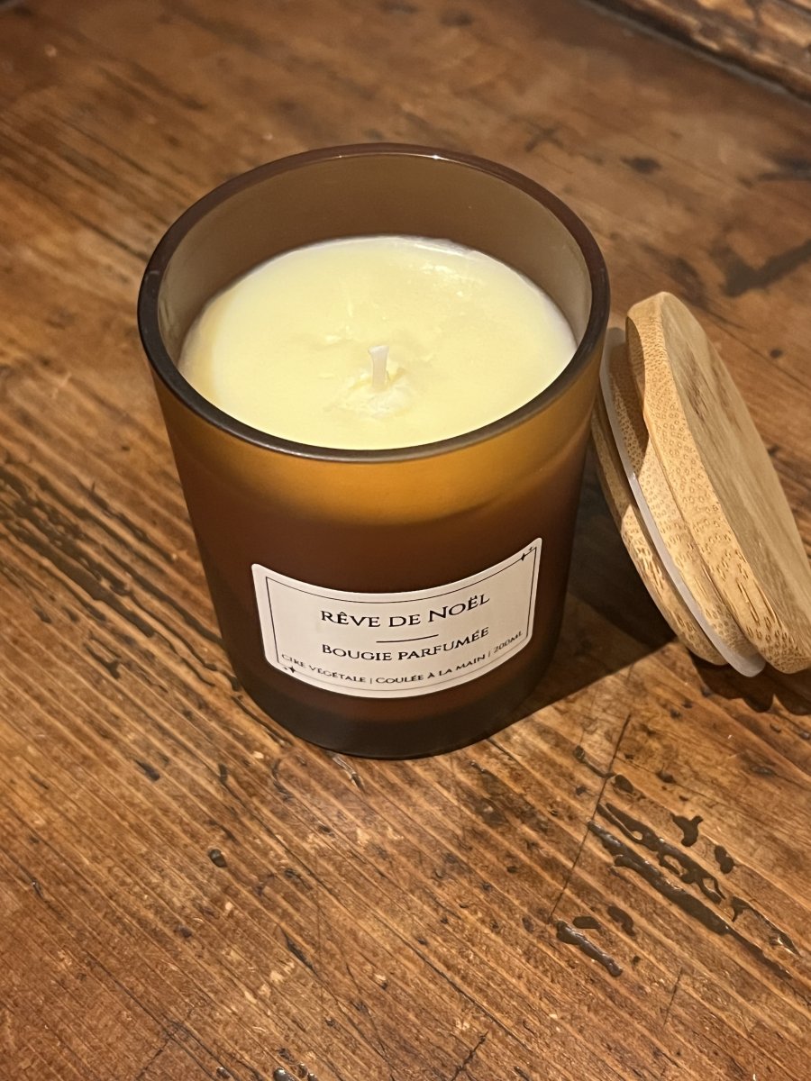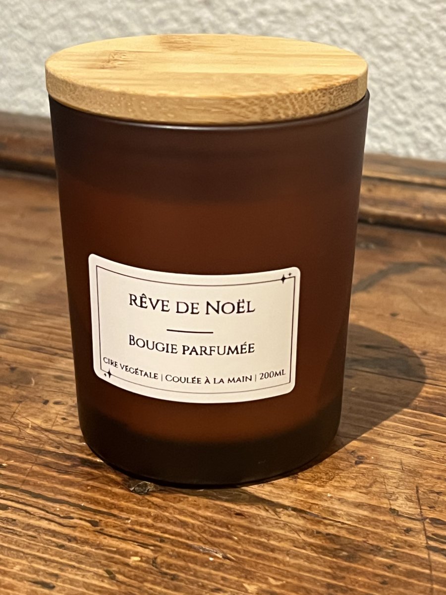 Bougie artisanale dans un pot en verre ambré avec couvercle en bois. 200ml